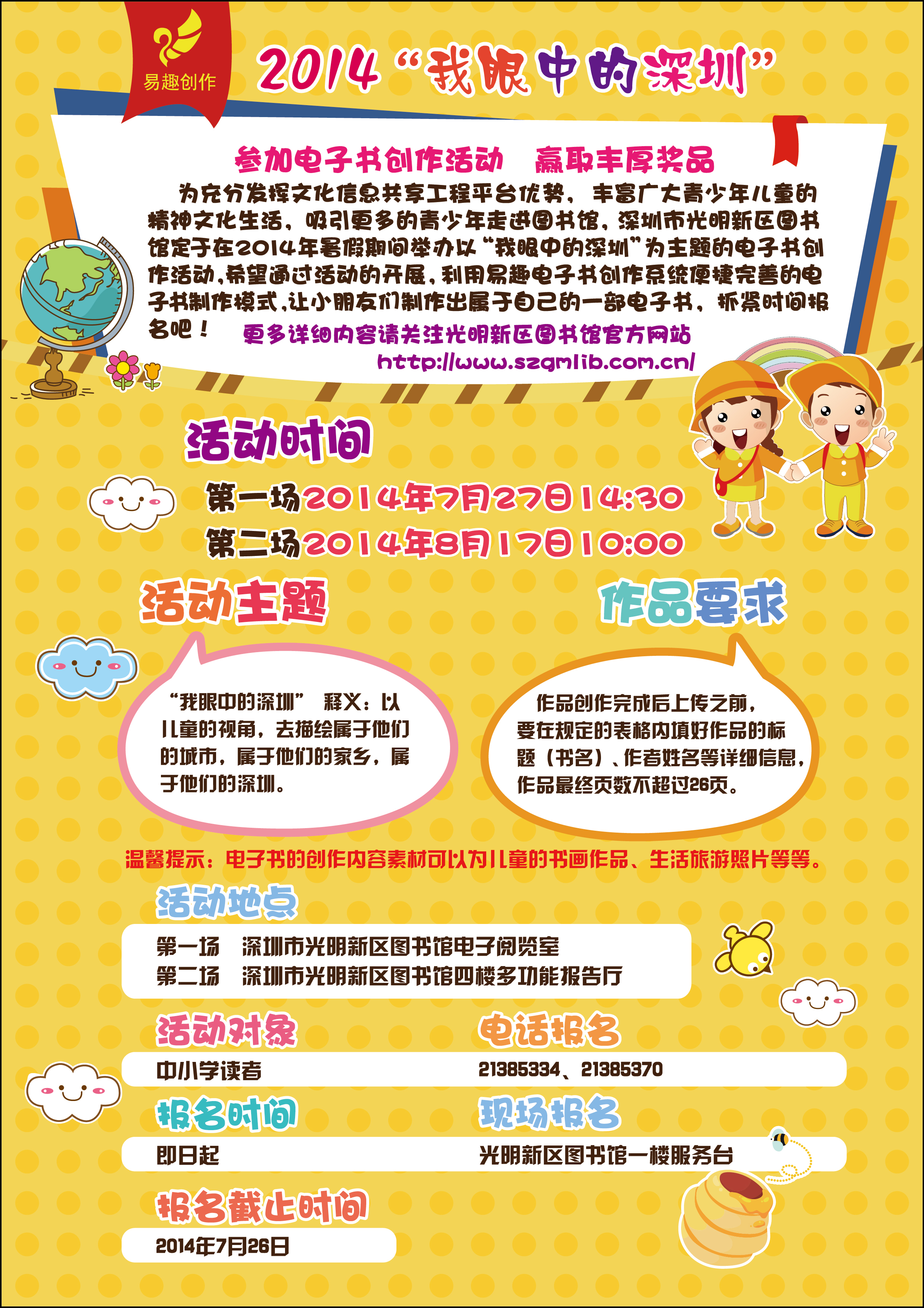 "我眼中的深圳”网络电子创作报名截止日期为7月26日,截止报名时间已经日益临近,有兴趣参与的小伙伴们或者各位家长赶紧来报名吧!