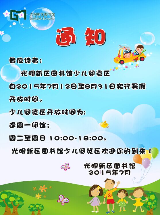 各位读者: 光明新区图书馆少儿阅览区自2015年7月12日至8月31日实行暑假开放时间。 少儿阅览区开放时间: 逢周一闭馆;周二至周日 10:00-18:00。 光明新区图书馆少儿阅览区欢迎您的到来!