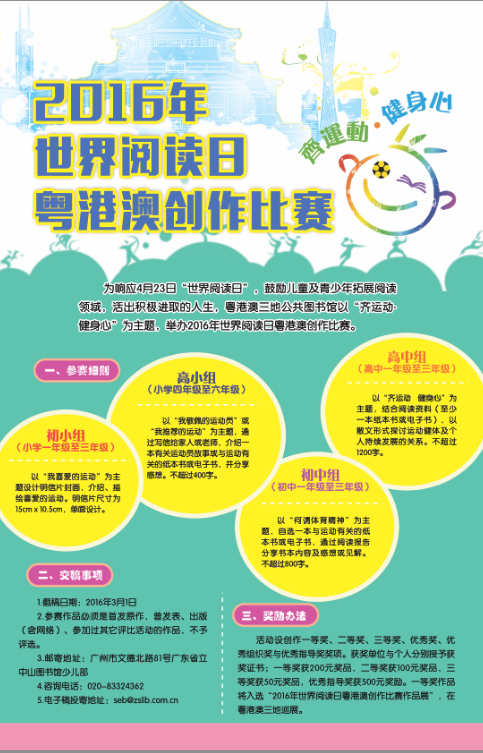 为响应4月23日“世界阅读日”,鼓励儿童及青少年拓展阅读领域,活出积极进取的人生,粤港澳三地公共图书馆以“齐运动‧健身心”为主题,举办2016年世界阅读日粤港澳创作比赛。