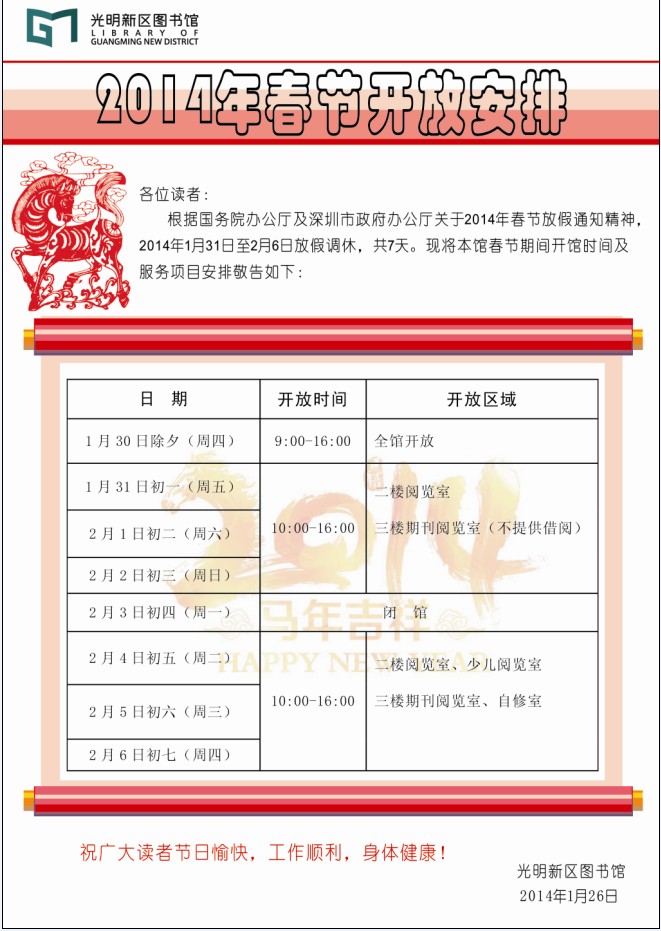 根据国家春节放假有关文件精神,结合新区图书馆实际情况,现将春节放假有关安排通知如下: